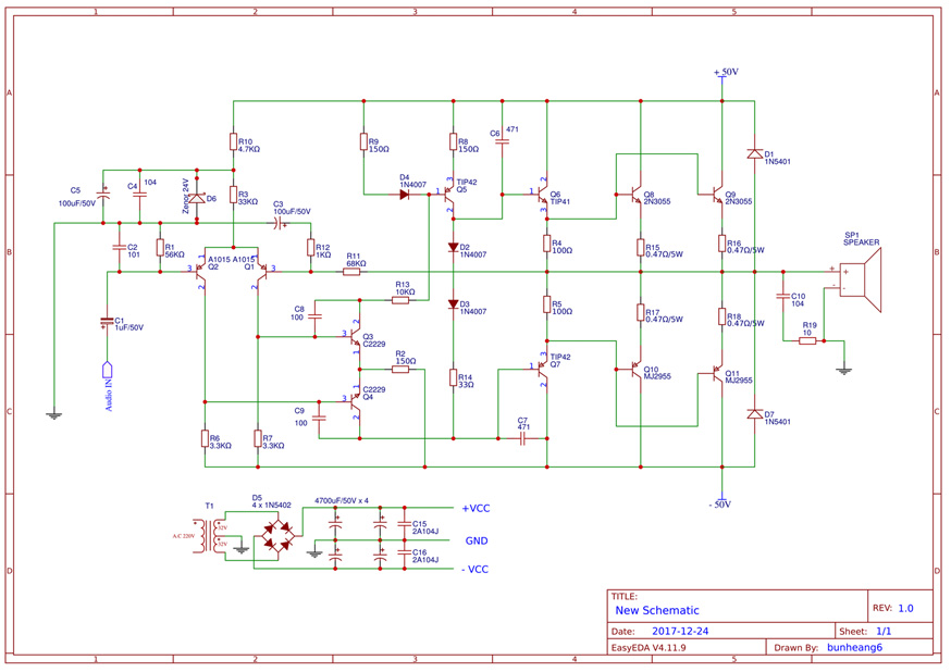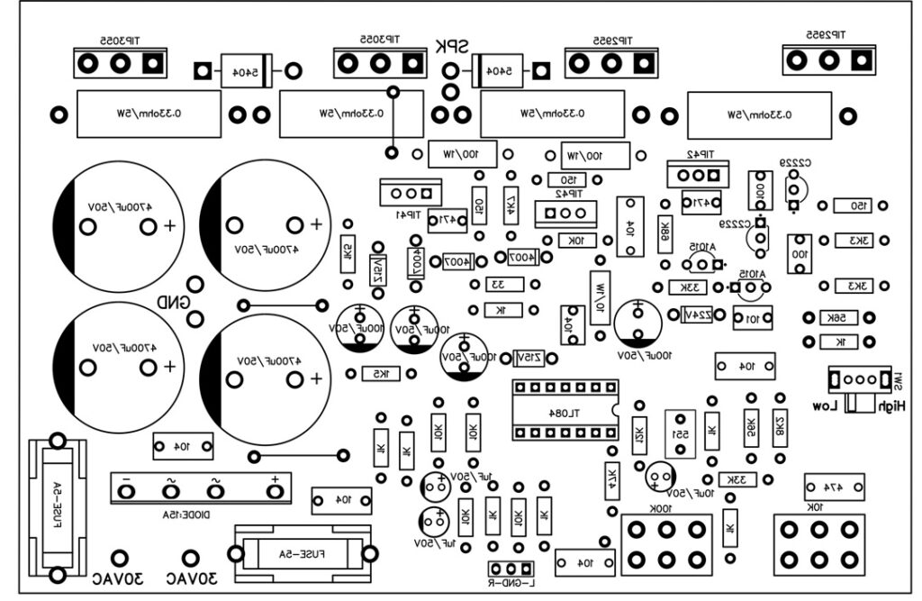 Diagrama de circuito do amplificador de 200 W TIP3055 TIP2955