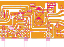 O circuito amplificador de 200 W utiliza transistores de saída TIP2955 e TIP3055. A tensão de operação é 2×42 V CC simétrica (2×30 V CA). O retificador de