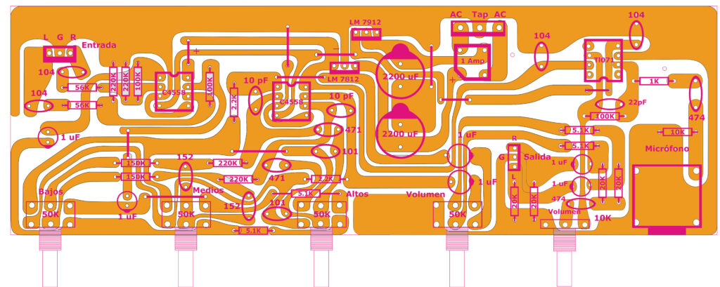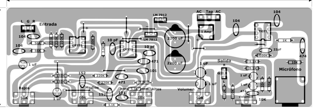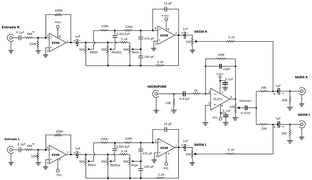 Como o 4558 é um amplificador operacional duplo, um de seus amplificadores é responsável por receber o sinal e amplificá-lo, e o outro amplificador é responsável por amplificar as frequências no equalizador de 3 bandas.
