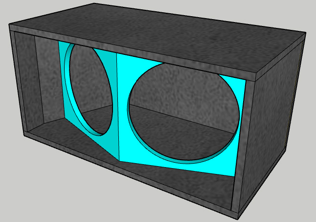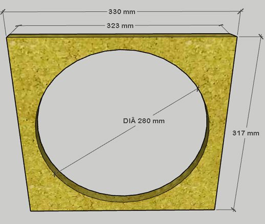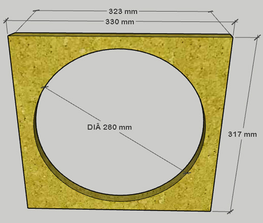 Podemos obervar os paineis onde serão instalados os alto falantes de 12 polegadas, podemos observar que temos uma aresta a medida de 330 mm e em outra aresta temos 323 mm, por 317 mm de altura, o furo para instalar os alto falantes depende do modelo do mesmo, aqui temos 280mm conforme os dados especificos do alto falante sugerido no artigo que é o JBL MODELO 12WP500.
