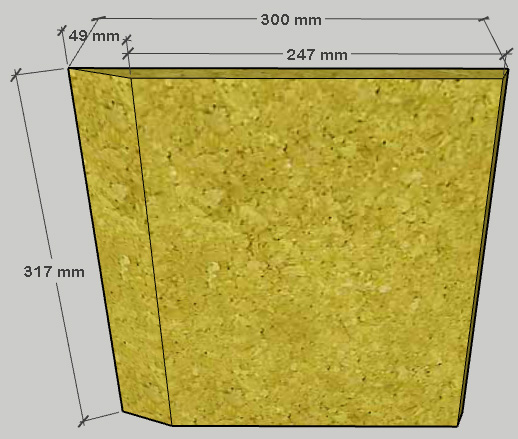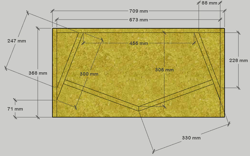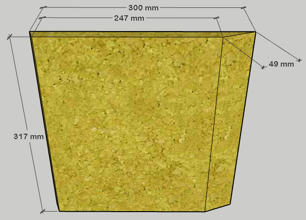 Os paineis da corneta da caixa tem um corte especial em um dos lados, como podemos observar nas imagens baixo, as suas são: na aresta maior do painel, temos 300 mm, na aresta menor temos 247 mm, a medida do corte como vemos tem 49 mm, são iguais em ambos os painel esquerdo e direito.